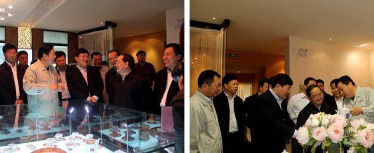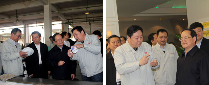 2012年4月6日江西省人民政府省長鹿心社一行在市委書記鄧保生、市長劉昌林等省市領(lǐng)導(dǎo)的陪同下來我司視察工作,鹿心社省長一行參觀了工廠生產(chǎn)車間、國瓷館,詳細(xì)了解了公司的生產(chǎn)運(yùn)營情 況并對(duì)公司產(chǎn)品贊不絕口。視察期間,鹿心社省長對(duì)公司給予了高度評(píng)價(jià):“你們公司為景德鎮(zhèn)爭了光,為江西爭了光,為國家爭了光。"并希望公司能牢牢抓住精品路線,抓住高端市場(chǎng),搞活機(jī)制,繼續(xù)做的更大更好。