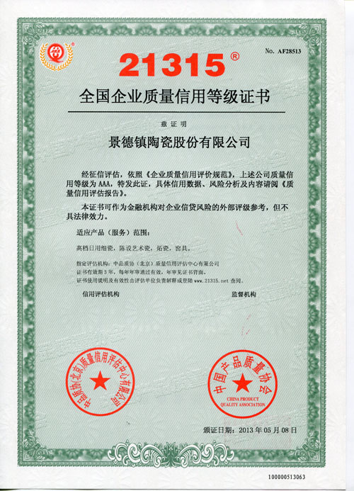 據(jù)了解,榮獲《中國21315質(zhì)量信用等級AAA級證書》的企業(yè)可在網(wǎng)站系統(tǒng)上進(jìn)行查詢。質(zhì)量信用等級從AAA到D共有10個級別,AAA級是質(zhì)量信用等級的最高級別,意思是產(chǎn)品質(zhì)量信用“非常好”。