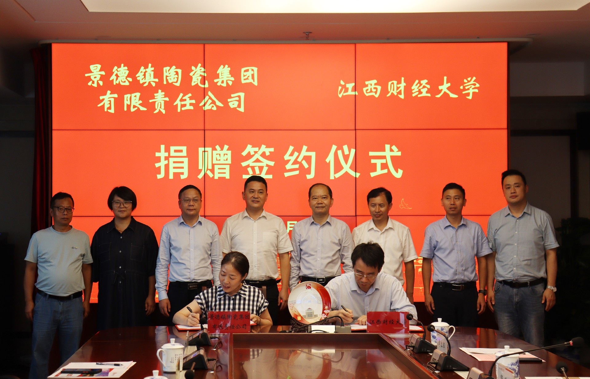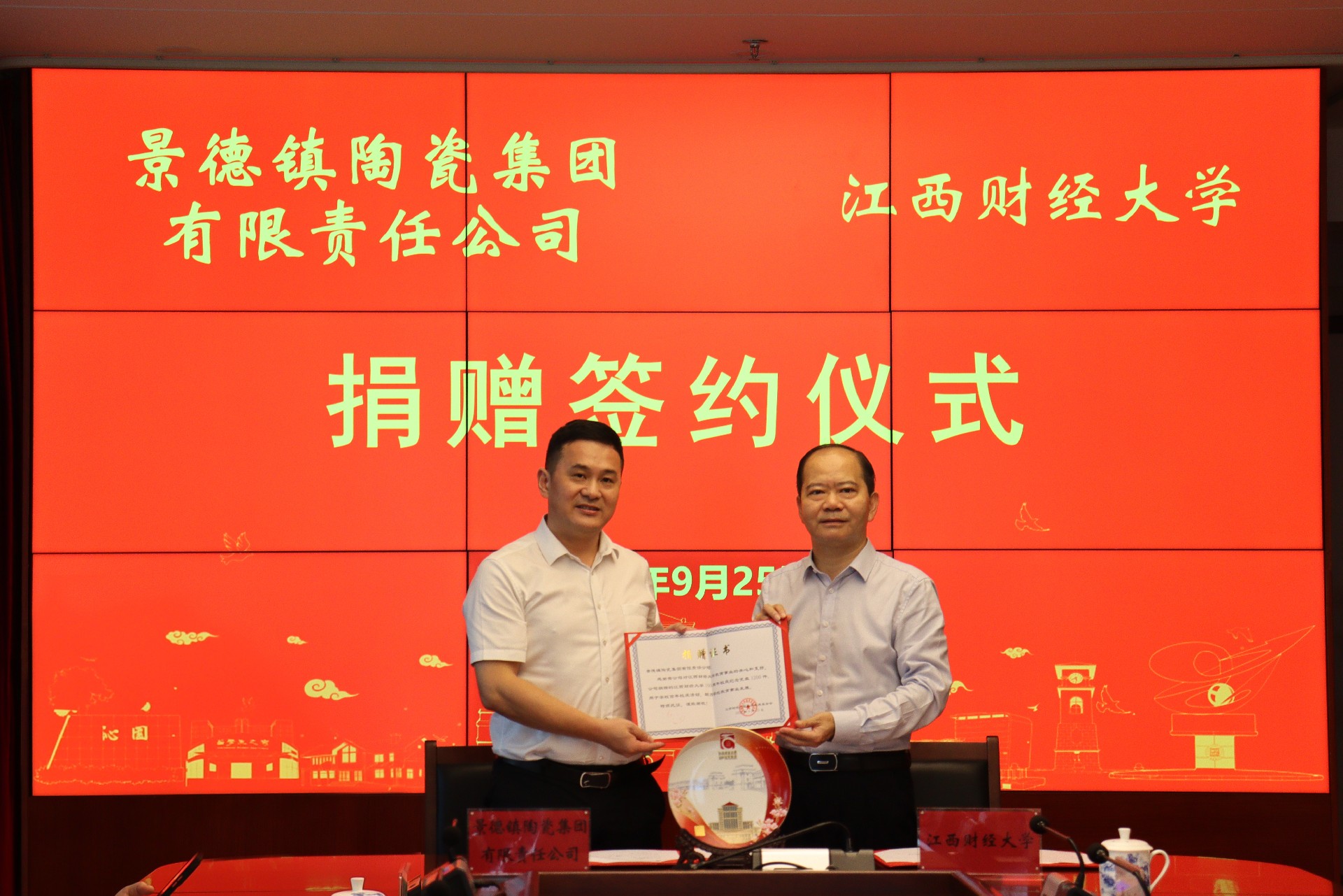 簽約儀式上,吳愛云代表景陶集團與江西財經大學簽署捐贈協(xié)議,并捐贈紀念瓷盤,鄧景揚代表景陶集團接受江西財大頒發(fā)的《捐贈證書》。
